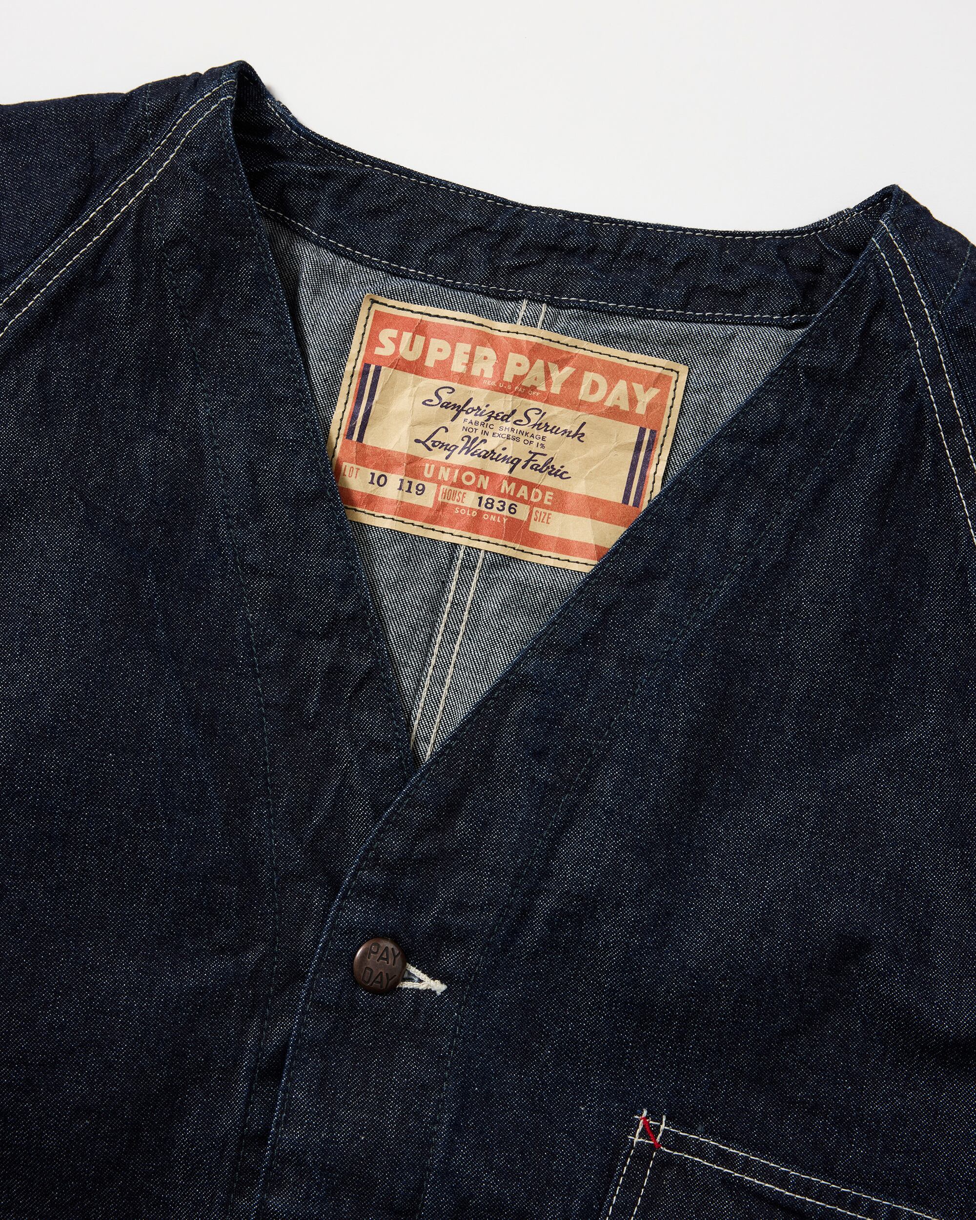 PAYDAYの顔でもあるラグランスリーブが特徴で、タック釦は当時のものを忠実に復刻しています。INDIGOとBLACKの2色展開です。日本人の体形にあうようにパターンで調整していますので、着やすく仕上がっています。是非羽織もの感覚でお楽しみください。