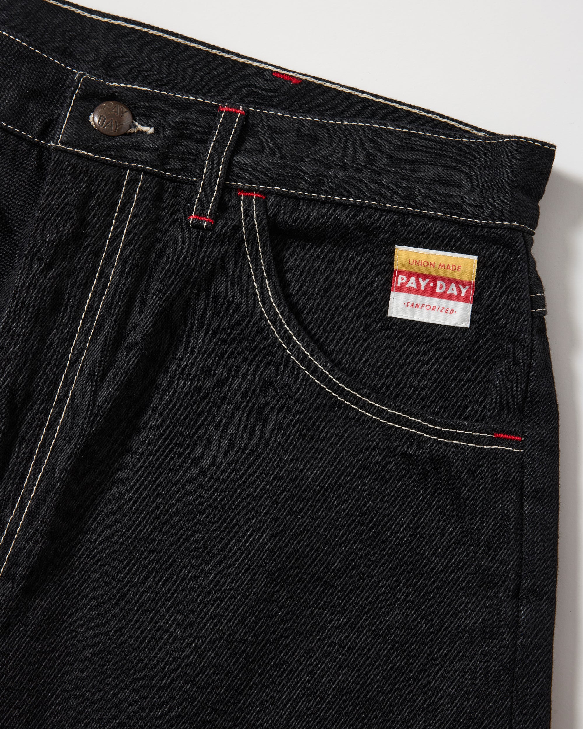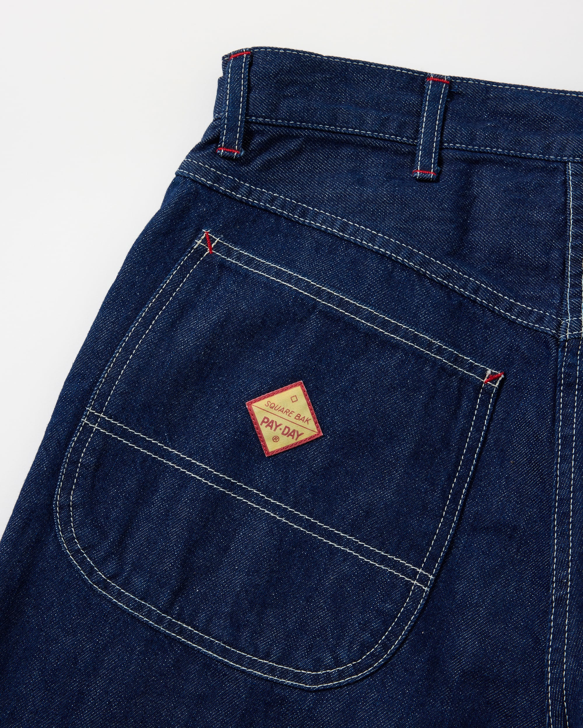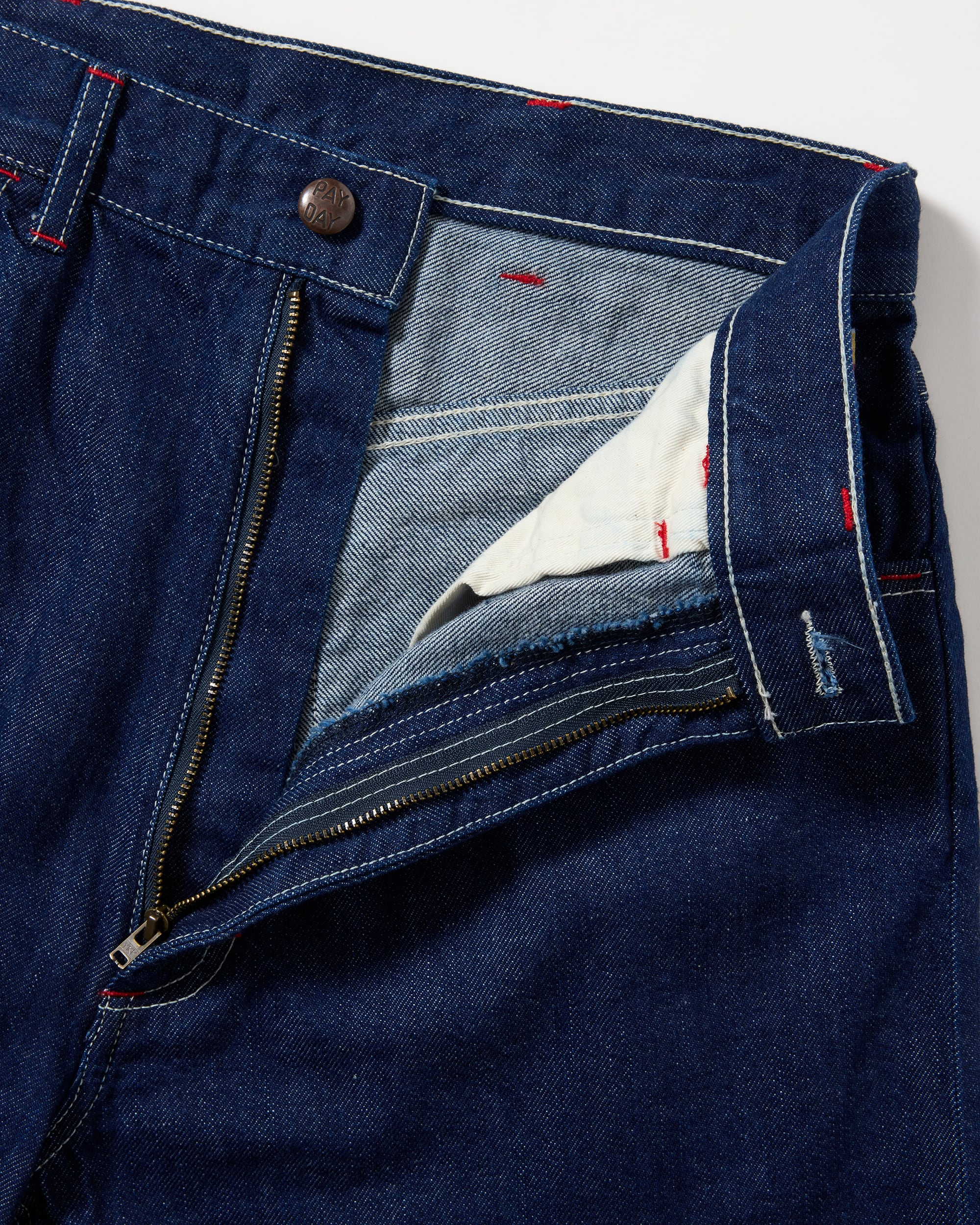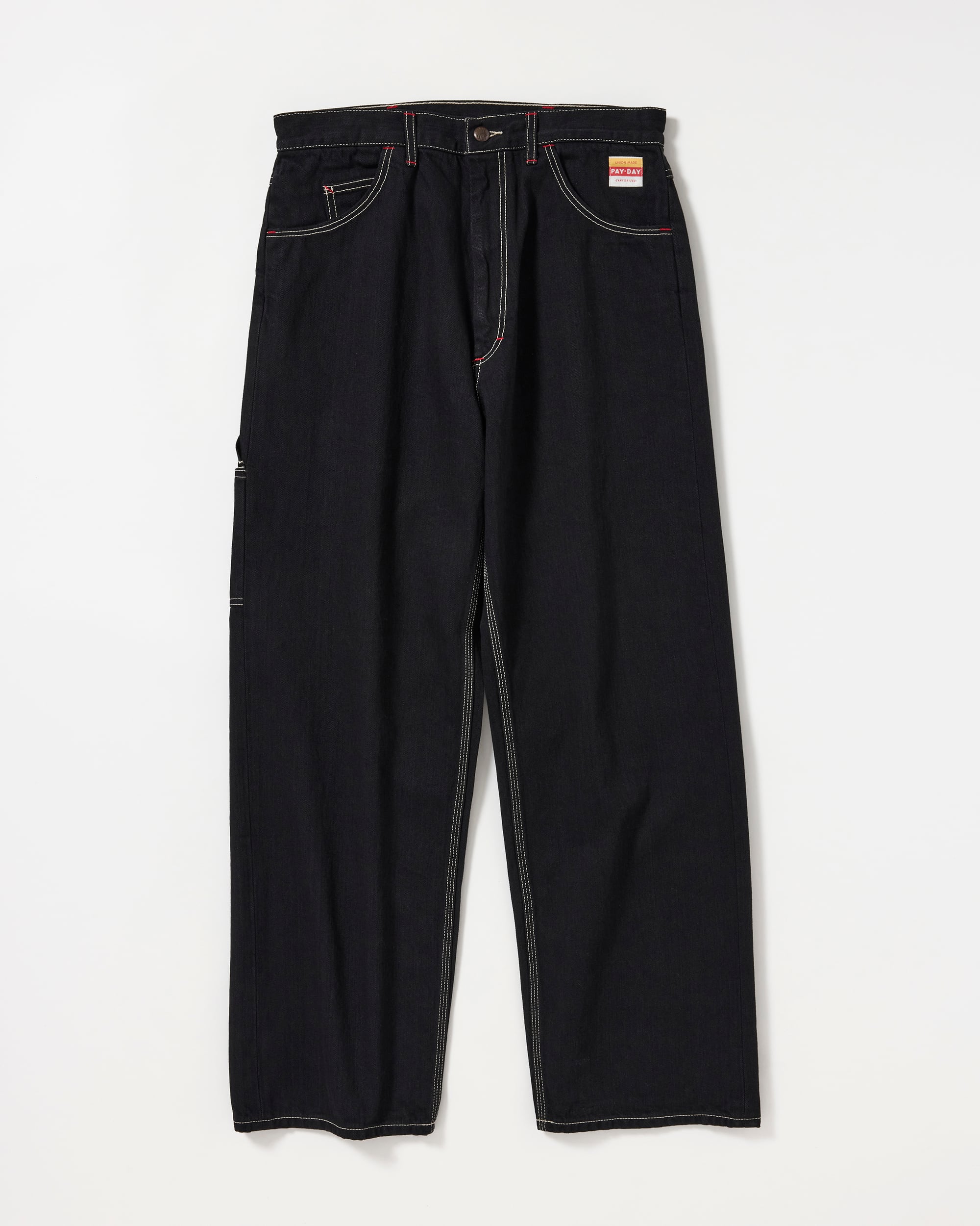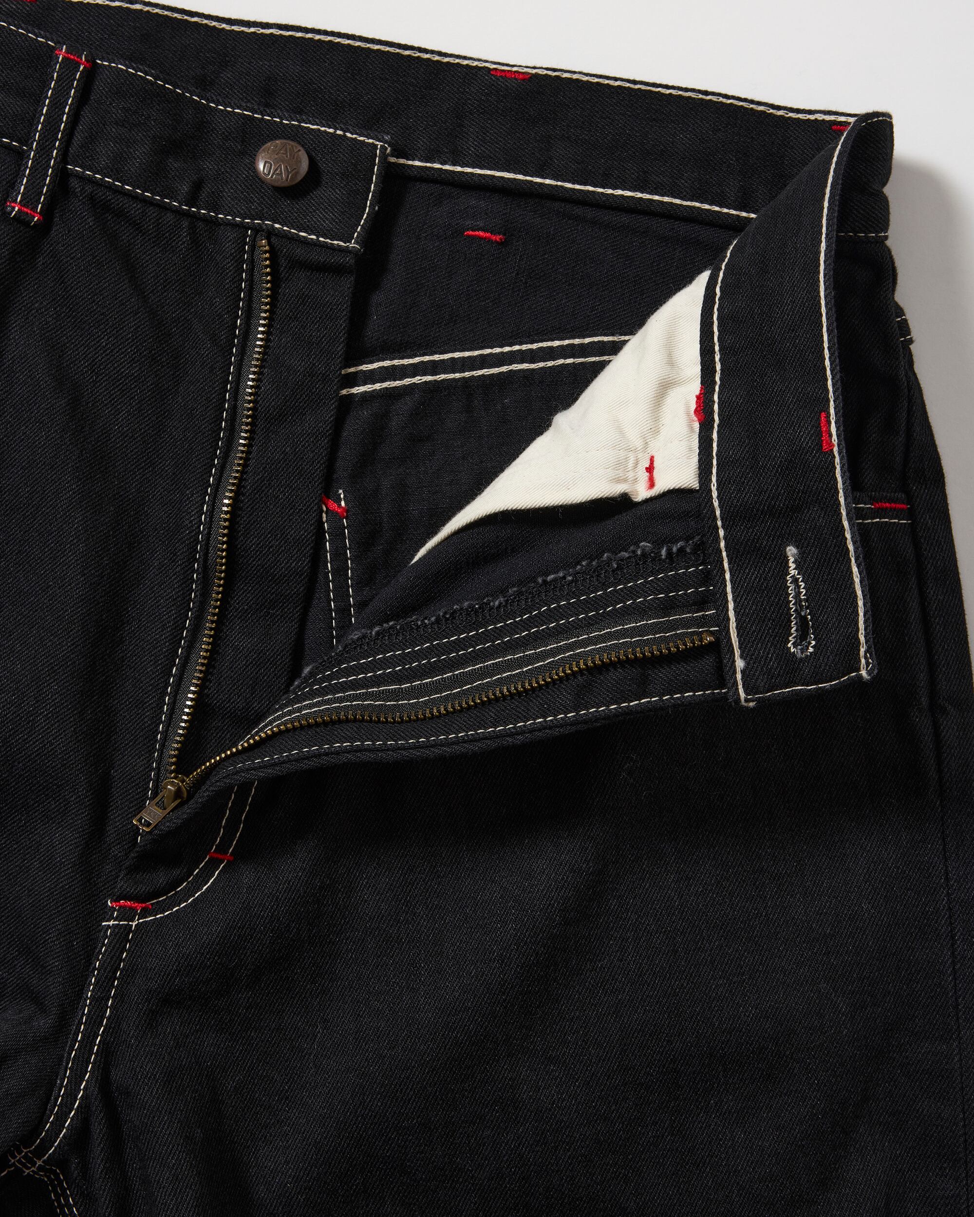 INDIGOとBLACKの2色展開で、いずれもワンウオッシュ加工を施しています。12ozムラ糸ブラックデニムを採用、飾りステッチは当時と同じ綿糸を使用し、PAYDAYの顔でもあるブランドネームやタック釦は完全復刻しています。